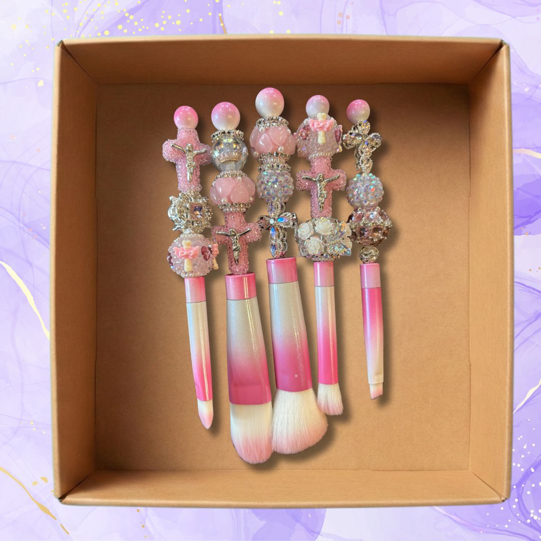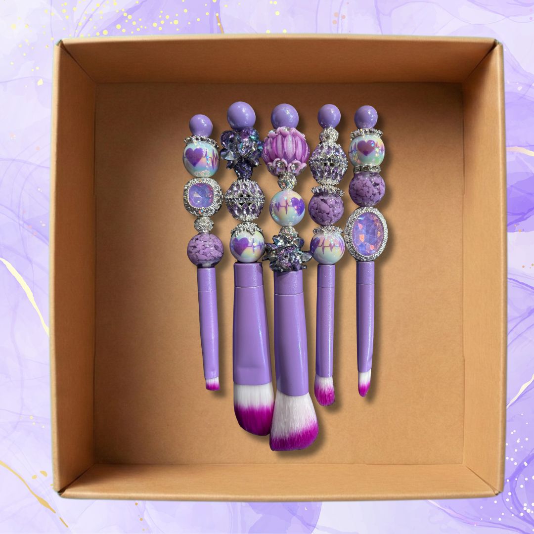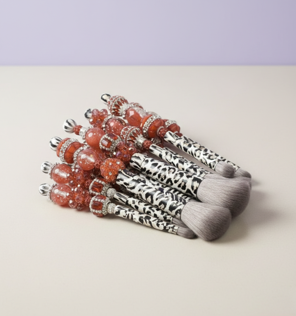 A curated set of custom makeup brushes selected for variety and visual balance. Expect different brush types, bead accents, and handle designs. Some feel bold and decorative. Others stay more neutral and clean.